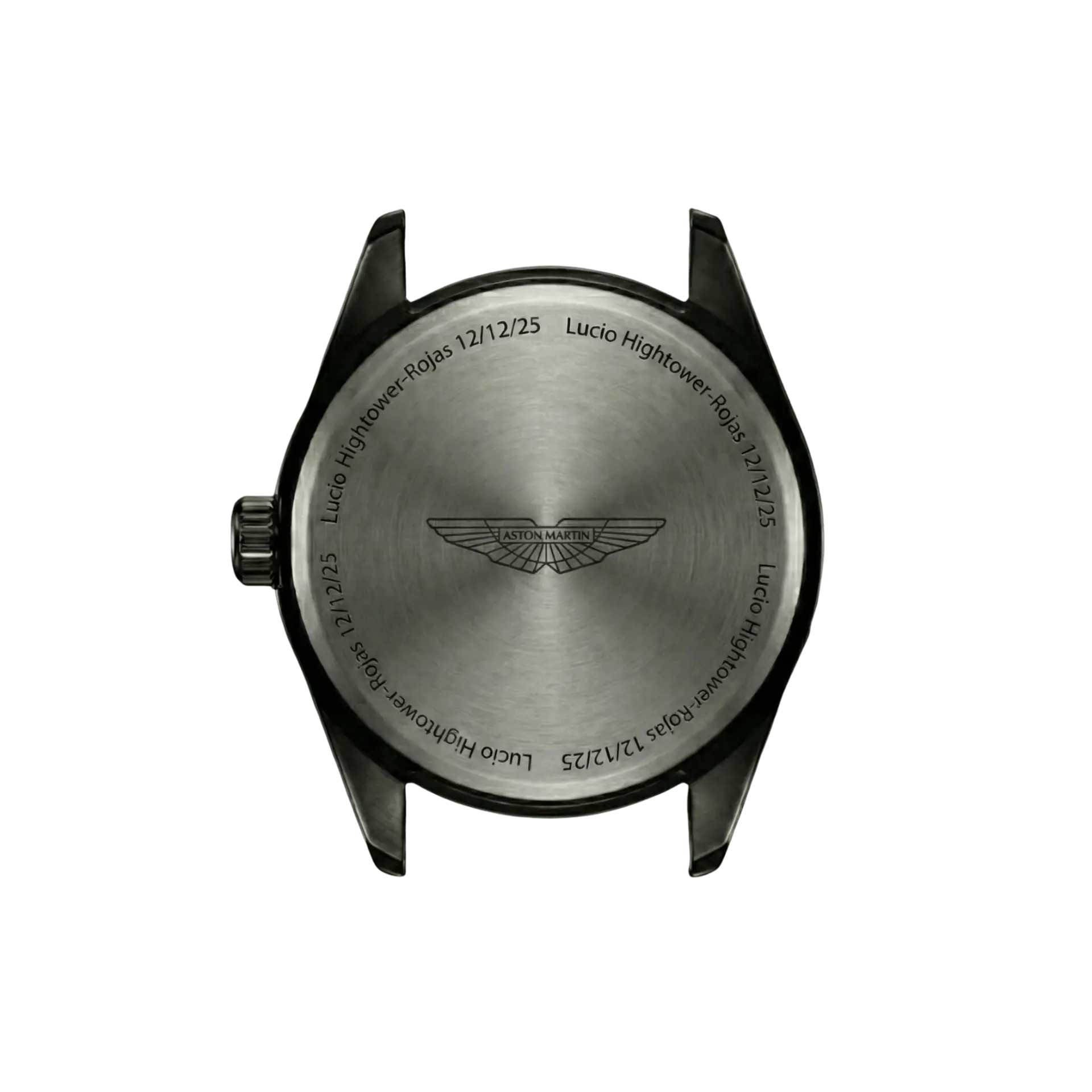 An homage to the "explosive power in a black tie,” the dial nods to the DBS’s turbine like wheel design. Its spin is an echo to the 7,000 RPM redline generated by the DBS Superleggera’s 5.2L twin turbo V12, and its case is a sleek midnight steel, a reference to the elegant, predatory look of Onyx Black (our favorite colorwave).